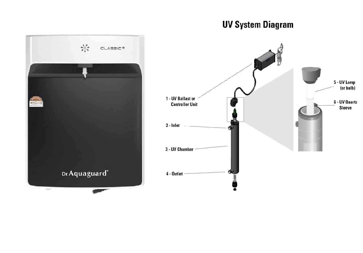 UV or Ultraviolet water purifier is proven technology that capable to kill water borne disease causing microorganisms, pathogens such as bacteria, viruses and cysts. This environmental friendly technology didn’t use any chemical during the purification process. UV water purifier consists a UV lamp tube through which water has to pass for purification. UV lamp releases UV lamp, when running water exposed to UV light, whatever germs like bacteria and viruses are damaged, inactive. Germs dead bodies remains in water, but these are not harmful any more.