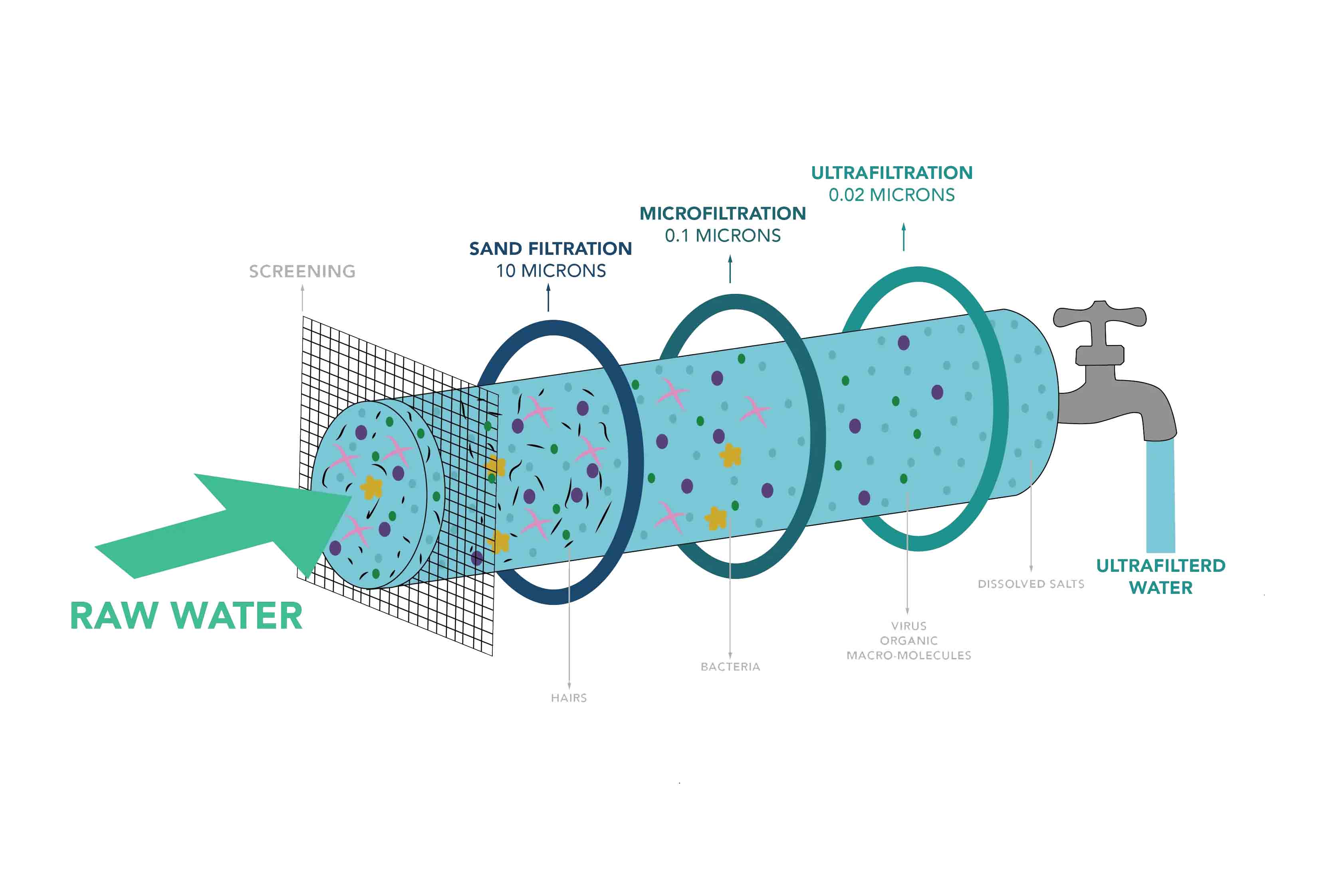 The important thing is to remember that UF does not work with hard water. As UF does not remove dissolved salts present in hard water, as result before and after purification, water as it is hard only.